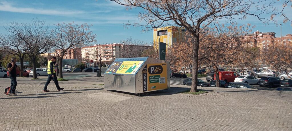 Dicho aparcamiento, modular, cerrado y cubierto, tiene capacidad para seis bicicletas. Es un Bicihangar Rocket diseñado, desarrollado y fabricado por Don Cicleto, preparado para un uso intensivo y concebido para proteger las bicicletas de condiciones climatológicas adversas, robos y vandalismo.